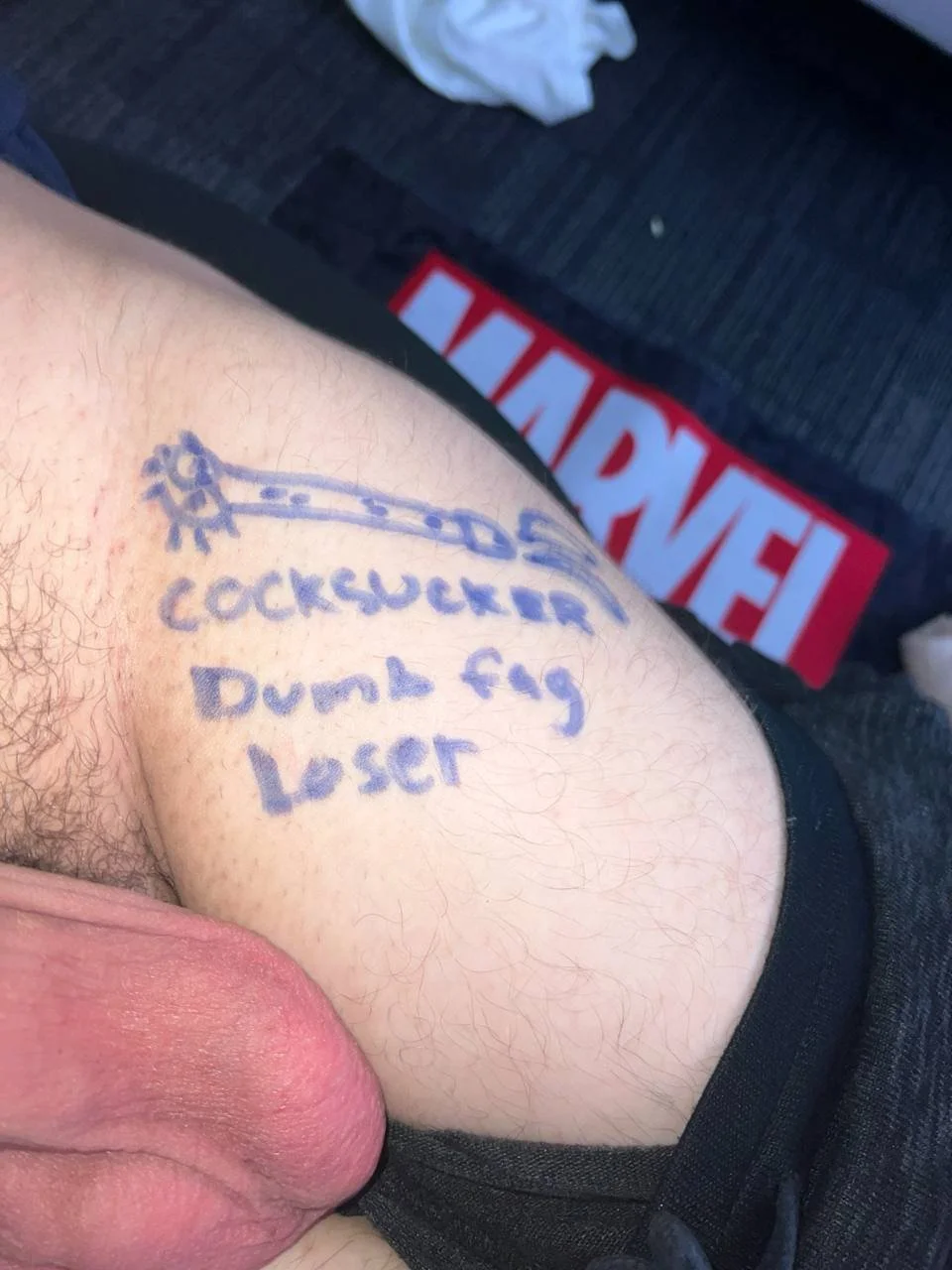 Jake loves to be reminded of what he is, just a slutty bitch for his daddy, and what better way to do that than to mark his entire body with those affirmations and reminders. It was a joint effort, we started out simple with a drawing of a cock to remind of what he should worship every day. After that came all the different names that he just loves to be called by daddy. Slut, whore, fag, bitch, etc. He loved every second, the more he got marked the hornier he got, and the more he wanted to do. By the end of it, I honestly have to say that this sexy bitch has truly turned into a work of art. Every inch of him covered by what he is and what he needs to be for daddy. I’d love to fuck him while he’s like that, just listing off every single thing on him while ramming my fat daddy cock into him, harder and harder with each name I call him. All that intense fucking would probably have us both sweating and smudging all of that way and I’d have to stop because I can’t read them anymore. He’d be begging to get marked even more just to have daddy slam his cock deep inside him one more time. What do you think, did we get all of the different things Jake is for his daddy? ;)