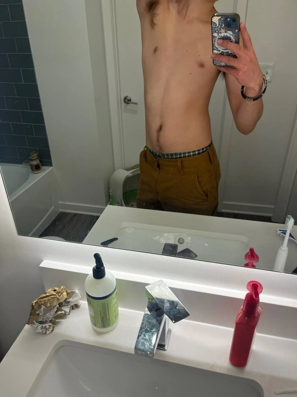 but to tease me. Every glance at the camera is calculated. Every move says, “I know you’re watching.” And he makes sure I don’t miss a thing. Shirt slips over his head. He pauses. Lets me take it in. Then the waistband lowers—inch by inch.
